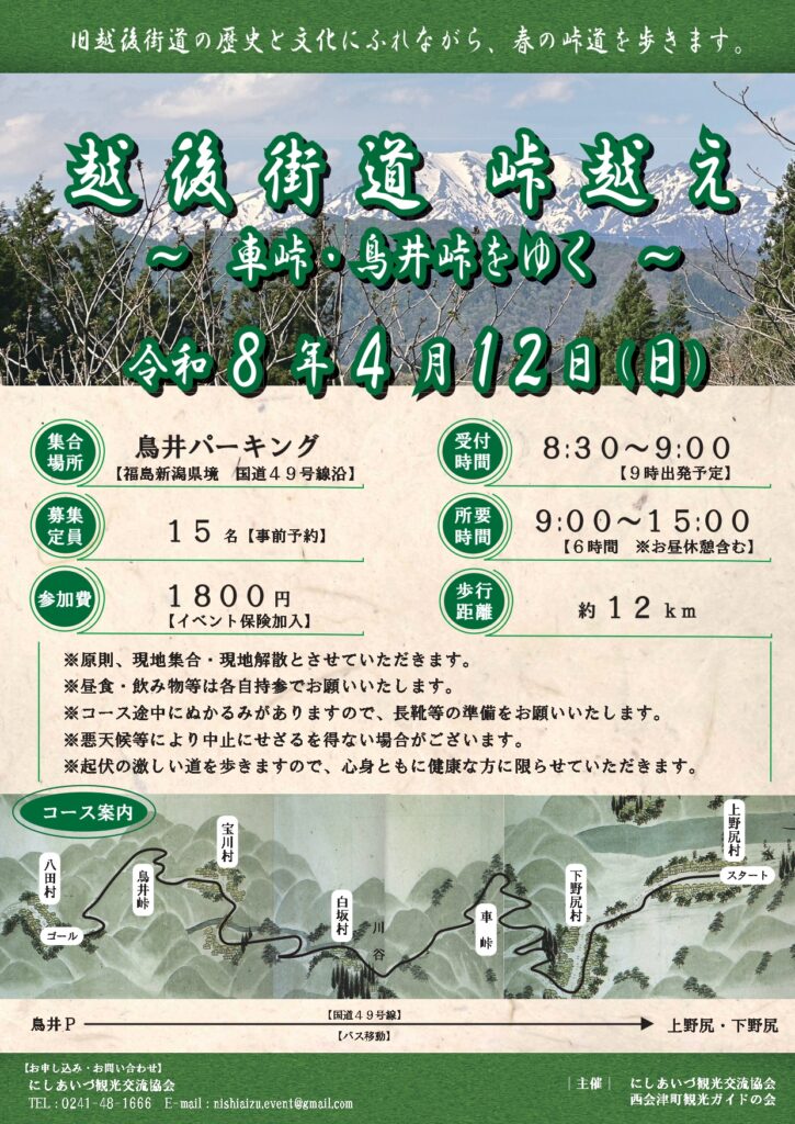 令和8年4月12日(日)、「越後街道峠越え~車峠・鳥井峠をゆく~」を開催します!!
