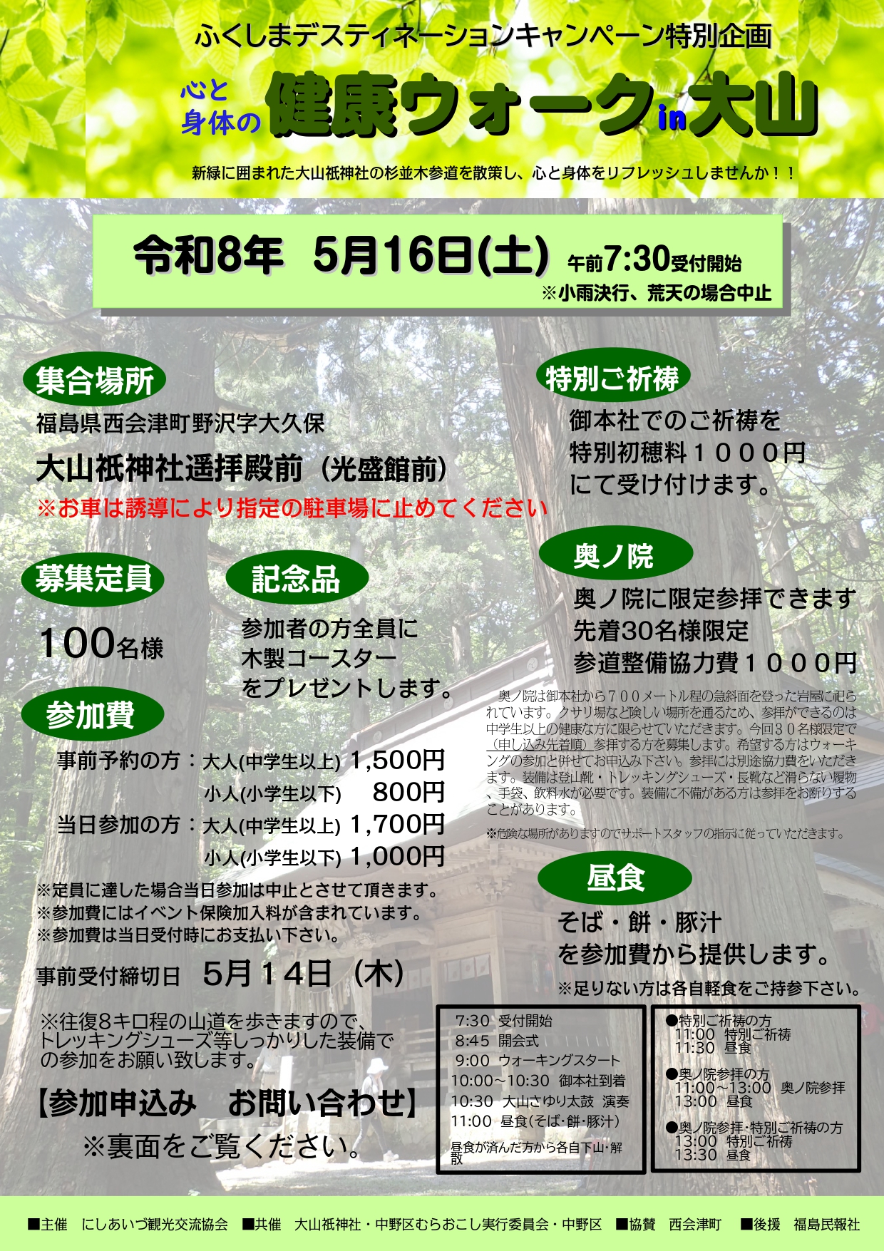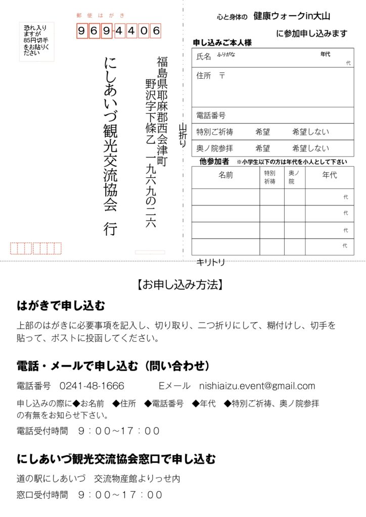 ・窓口申込(チラシ裏面の申込書をにしあいづ観光交流協会観光案内窓口までお持込ください)